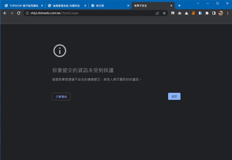 如果按下"仍要傳送",是可以繼續將畫面導向到綠界,但是會有"cross site"的失敗,依然會失敗,